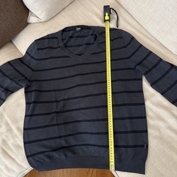 Maglione grigio. Della marca hugo boss ed ancora fatto di cotone ed anche di stile maglia a v in più un reparto di tipo uomo come : boss / Usato qui in Italia ¬
